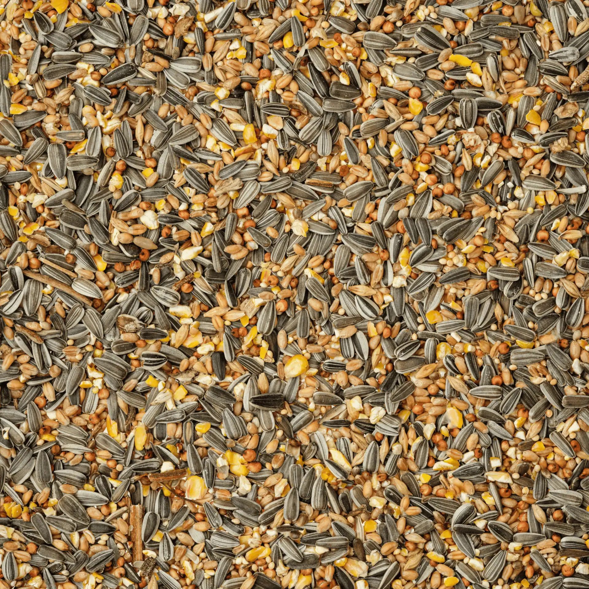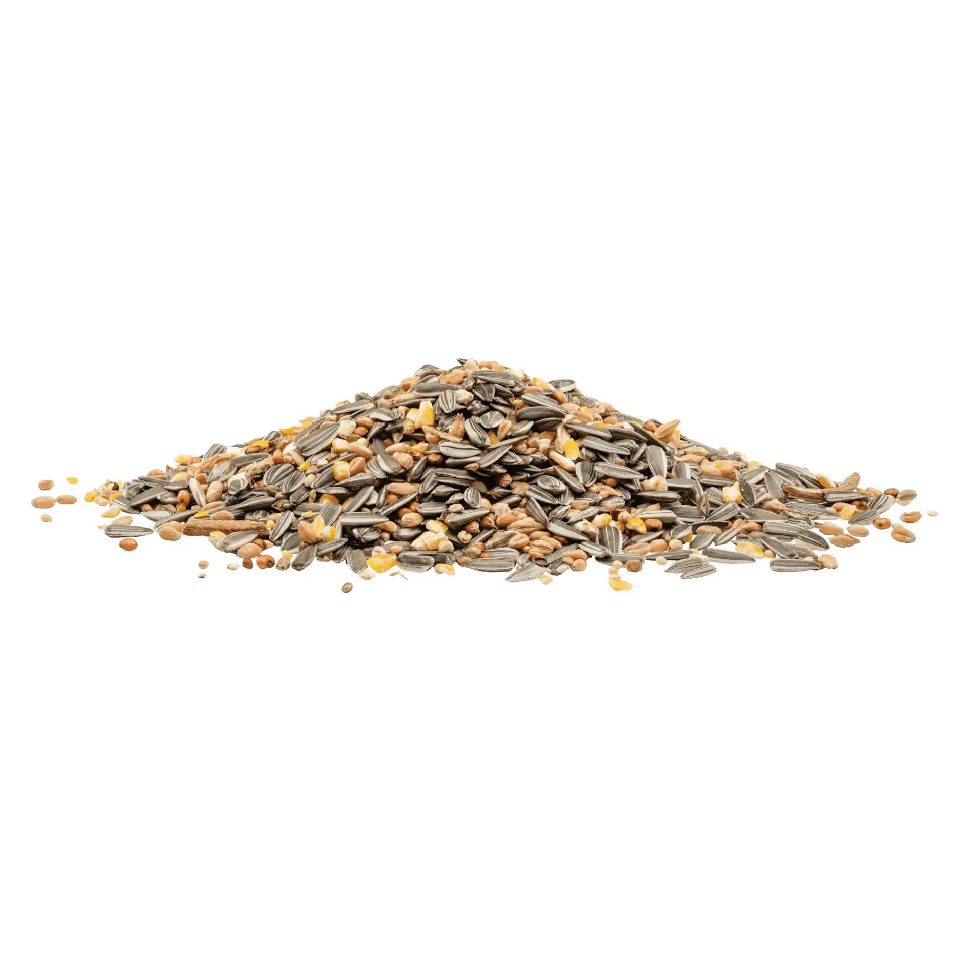 35,00 % randiga solrosfrön, 25,00 % vete, 17,00 % grovmalen majs, 10,00 % milokorn, 5,00 % gul hirs, 5,00 % maltkorn, 3,00 % europeisk hampa