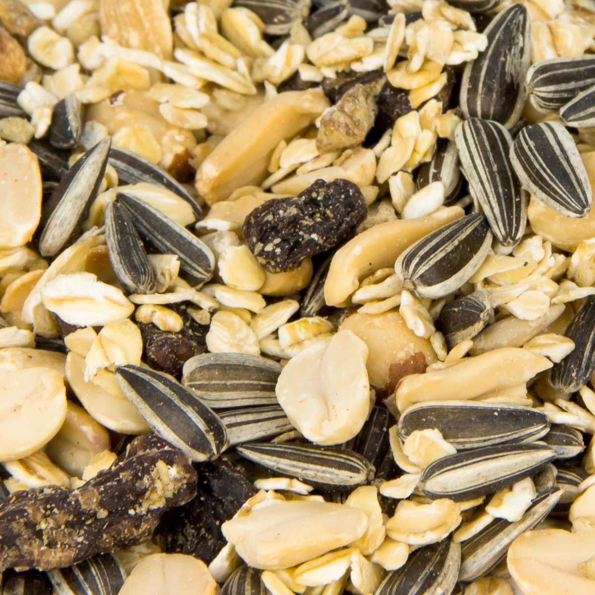44,00 % randiga solrosfrön, 32,56 % havregryn, 10,00 % rostade jordnötter, 6,40 % veteflingor, 3,28 % sultanrussin, 1,76 % jordnötter med "rött skal", 1,00 % enbär, 1,00 % rönnbär