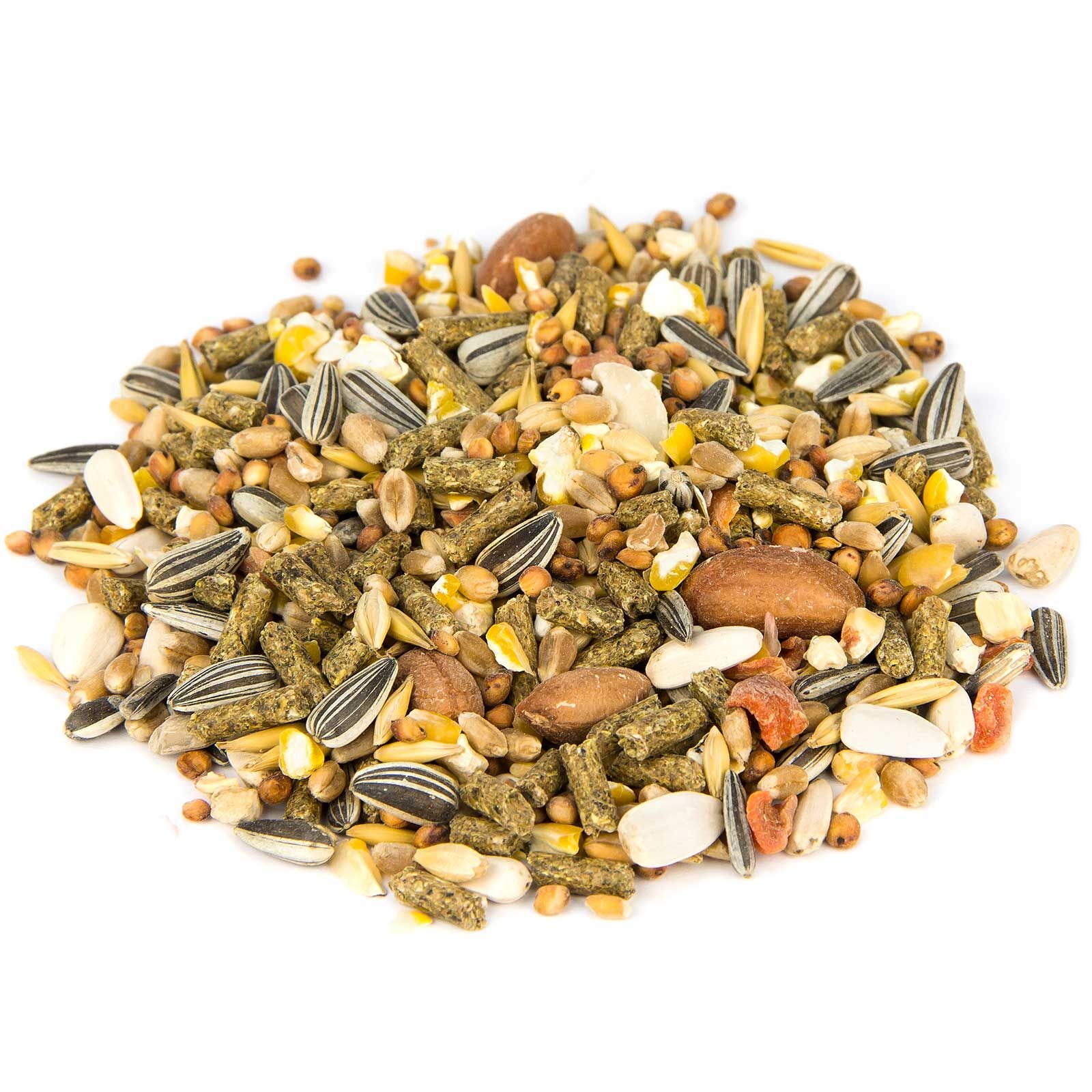 Vete, grovmalet majs, milokorn, randiga solrosfrön, grovt vetekli, grönmjöl, havre, maltkorn, "Red Skin" jordnötter, vita solrosfrön, tärnade morötter, majsstärkelse, torkad massa, rapsuttagningsmjöl med pinne, pumpafrönkaka, melass, lignocellulosa, kalciumkarbonat, monokalciumfosfat, natriumklorid, natriumbikarbonat, magnesiumoxid.