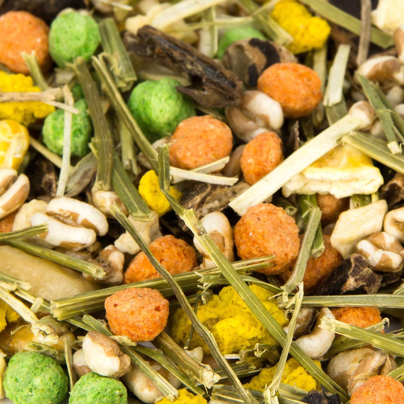 15,00 % johannesbröd, 12,50 % vete, 12,50 % majs, 10,00 % majskross röd, 10,00 % majskross gul, 10,00 % alfalfahö, 10,00 % majskross grön, 5,00 % jordnötter "Red Skin", 5,00 % ärtflingor, 5,00 % bananchips, 5,00 % äppeltärningar
