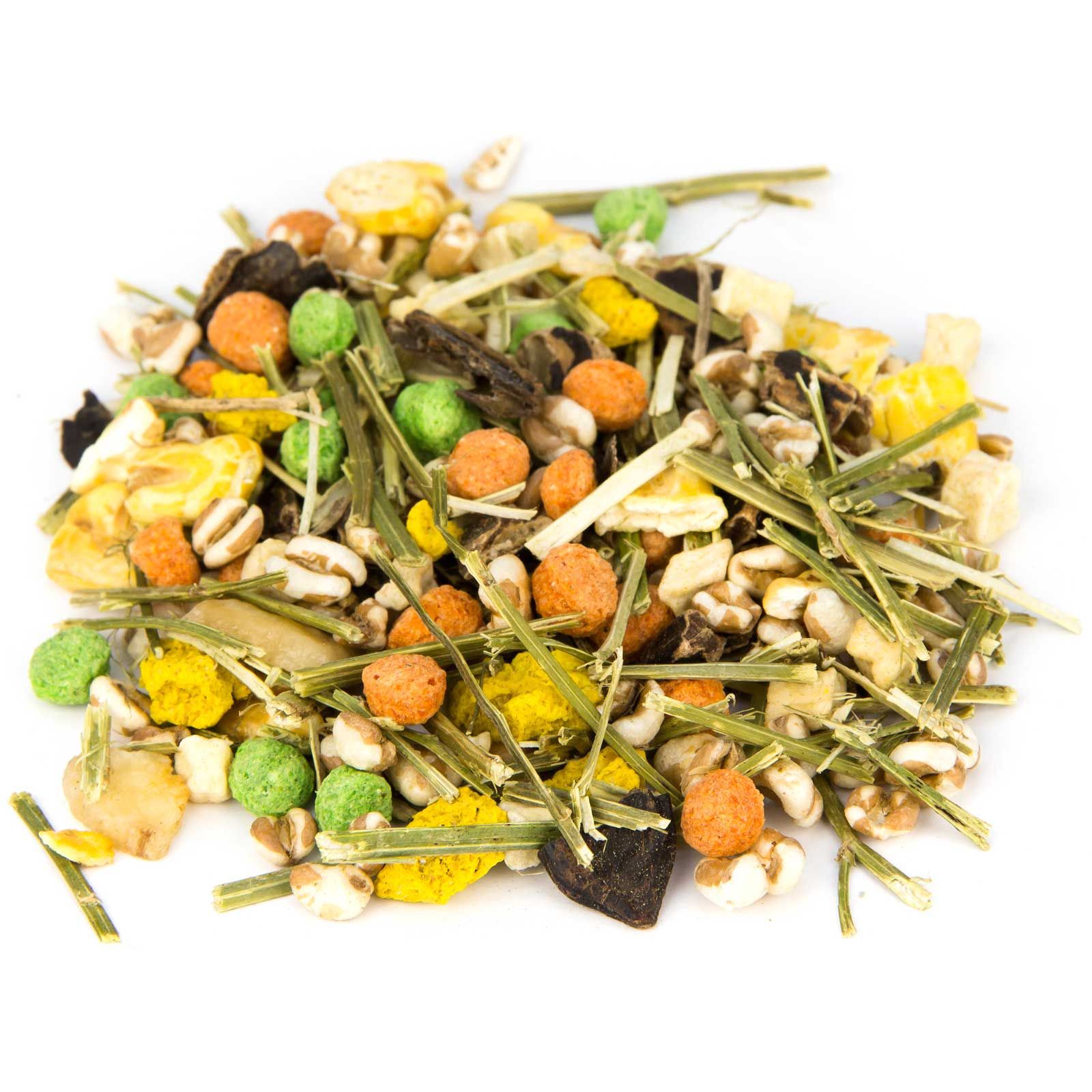15,00 % johannesbröd, 12,50 % vete, 12,50 % majs, 10,00 % majskross röd, 10,00 % majskross gul, 10,00 % alfalfahö, 10,00 % majskross grön, 5,00 % jordnötter "Red Skin", 5,00 % ärtflingor, 5,00 % bananchips, 5,00 % äppeltärningar
