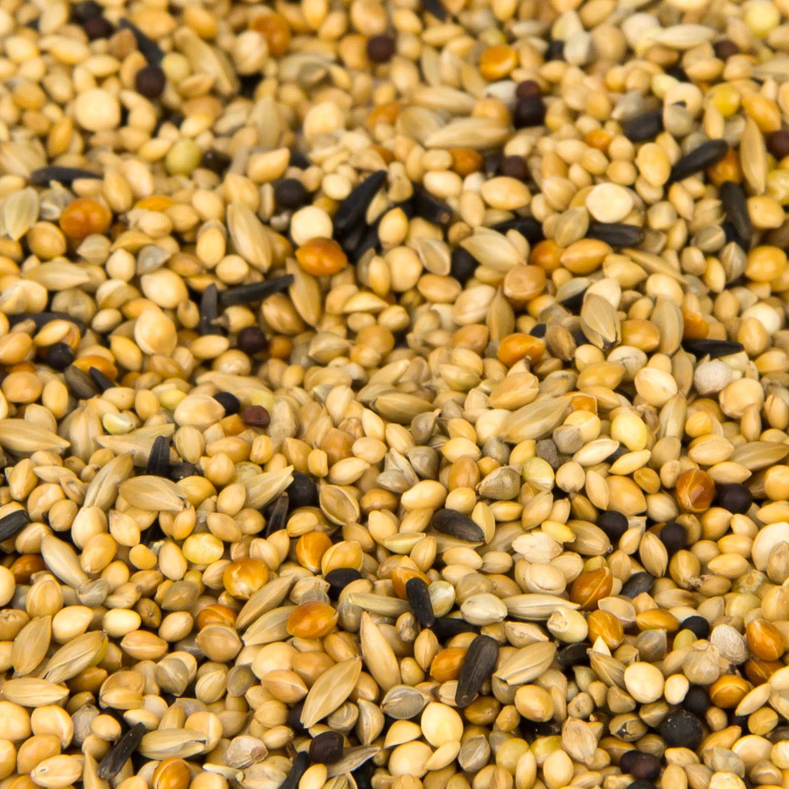 30,00 % gul hirs, 20,00 % Senegalhirs, 20,00 % platy millet, 10,00 % glänsande frö, 8,00 % röd hirs, 5,00 % japansk hirs, 4,00 % svart raps, 3,00 % negro frö.