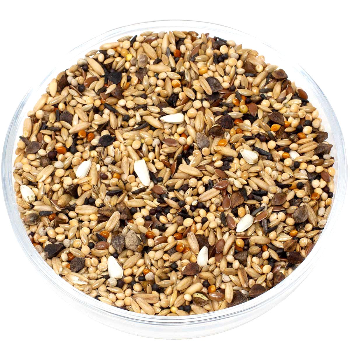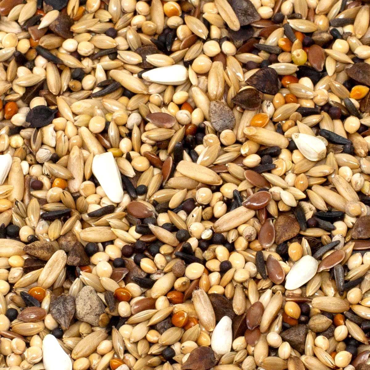 36 % glansfrö, 25 % gul hirs, 8 % havregryn, 7 % negrofrö, 7 % linfrö, 5 % bovete, 4 % röd hirs, 4 % svart raps, 2 % hjärtfrö, 1 % hampa, 1 % perillafrö vit.