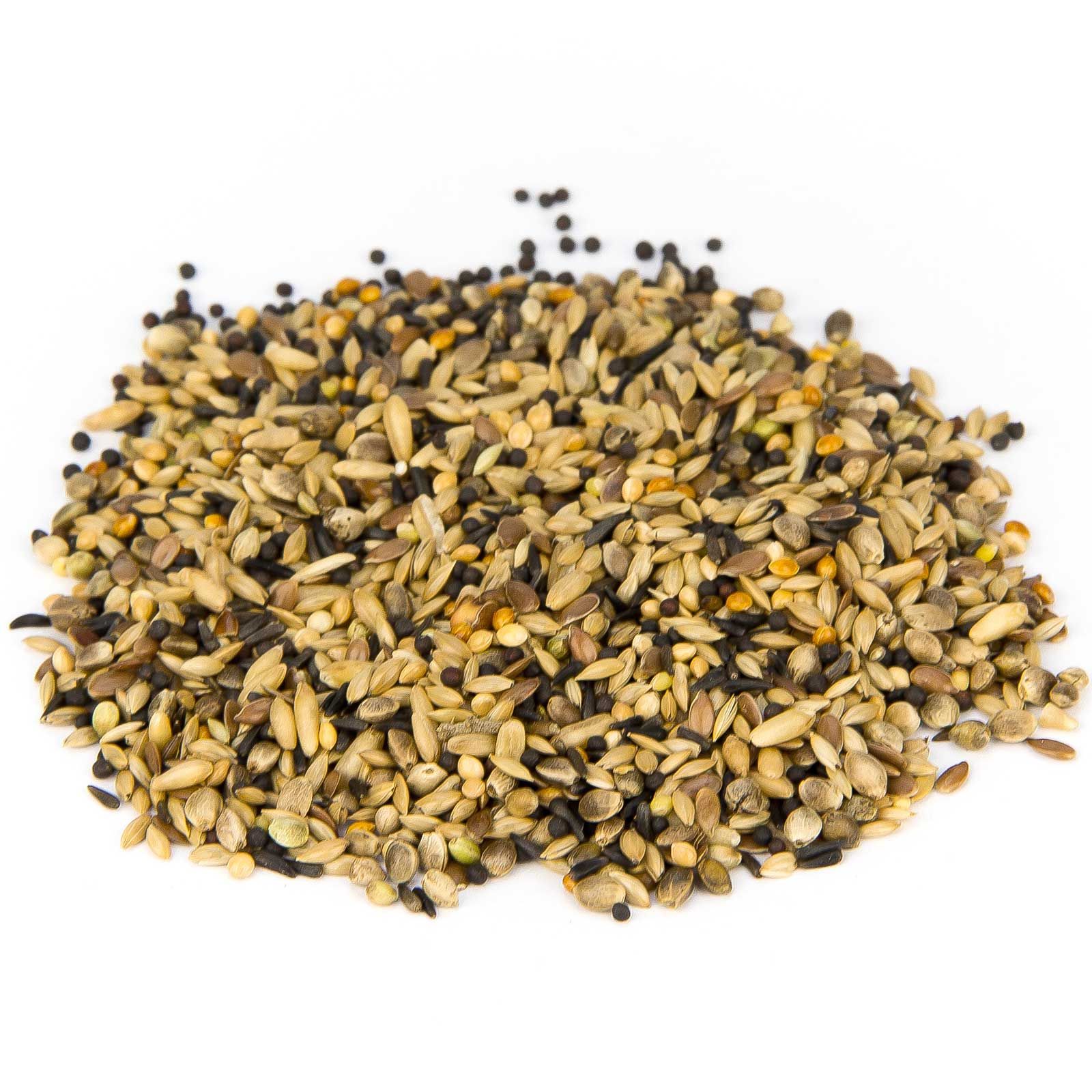 36,00 % glansfrö, 11,00 % europeisk hampa, 10,00 % havre, 10,00 % svart raps, 10,00 % gul hirs, 10,00 % linfrö, 9,00 % negrofrö, 4,00 % röd hirs