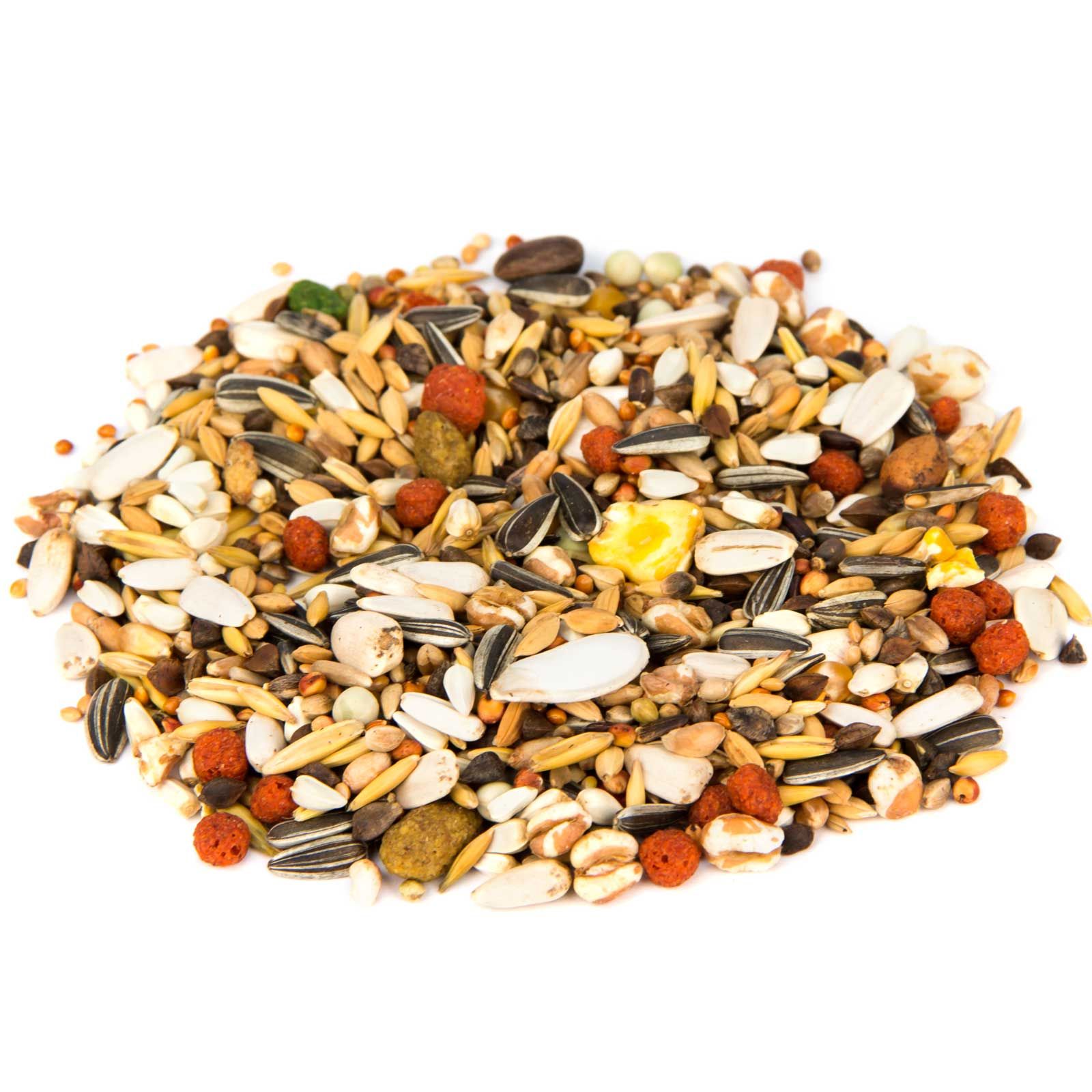 14 % kardifrön, 10 % paddyris, 9 % randiga solrosfrön, 8 % havre, 8 % bovete, 6 % vita solrosfrön, 5,44 % vete, 5 % milokorn, 4 % pinjenötter, 3 % europeisk hampa, 3 % gröna pumpafrön, 3 % poppat vete, 3 % liten majs, 3 % små gröna ärtor, 2,10 % majs, 2 % gul hirs, 2 % röd hirs, 2 % nyponrosor, 2 % mjölktistelfrön, 1 % glansiga frön, 1 % poppad majs, 1 % pepperoni, 0,60 % jordnötter, skalade, 0,60 % extraktmjöl av soja (bönor) med tvålstock (ånguppvärmd), 0,49 % vetemjöl, 0,30 % äppeltärningar, 0,12 % betesocker, 0,12 % kalciumkarbonat, 0,12 % solrosolja, 0,06 % mononatriumfosfat, 0,03 % DL-methionin, 0,02 % natriumklorid.