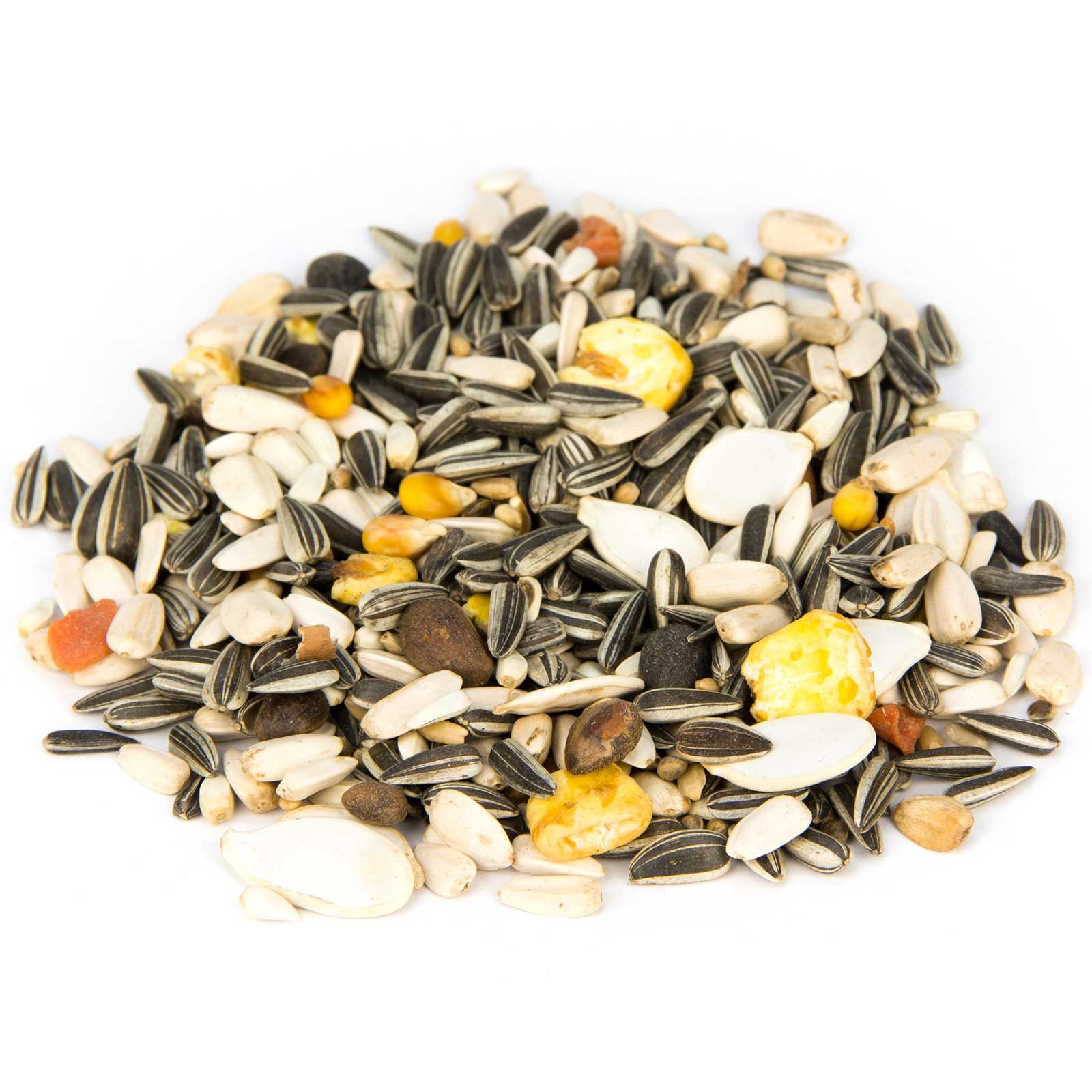 42 % randiga solrosor, 13 % vita solrosor, 3 % rött skal, 12 % hjärtfrön, 4 % medelstora pinjenötter, 8 % havregryn, 7 % liten majs, 6 % hampa, 3 % vita pumpafrön, 1 % morotsflingor, 1 % poppad majs.